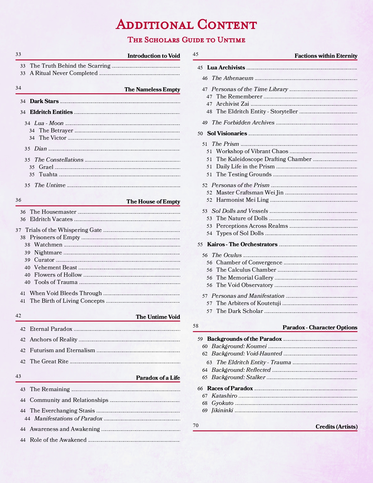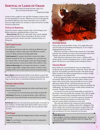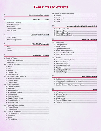 World lore covering the history, factions, and people of Sabi — enough to run sessions without guessing. Culture, traditions, and festivals that double as mechanical tools, not just flavour (thought they gave a nice unique vibe to some sessions during playtest). Additional exploration mechanics built around distinct chaos biomes, and environmental rules. Locations where your players can actually stop and breathe. A lot of items — consumables, survival tools, weapons, biome-specific gear. Some monsters too.