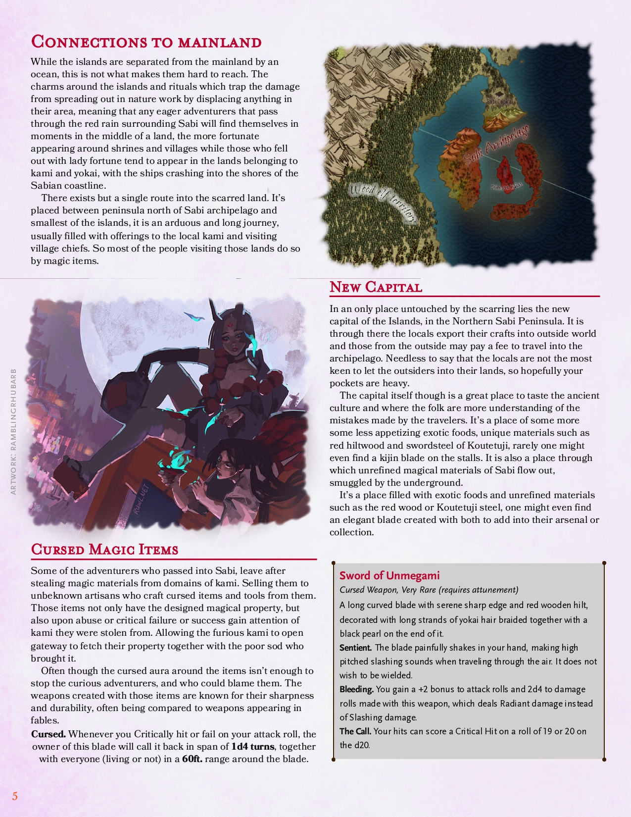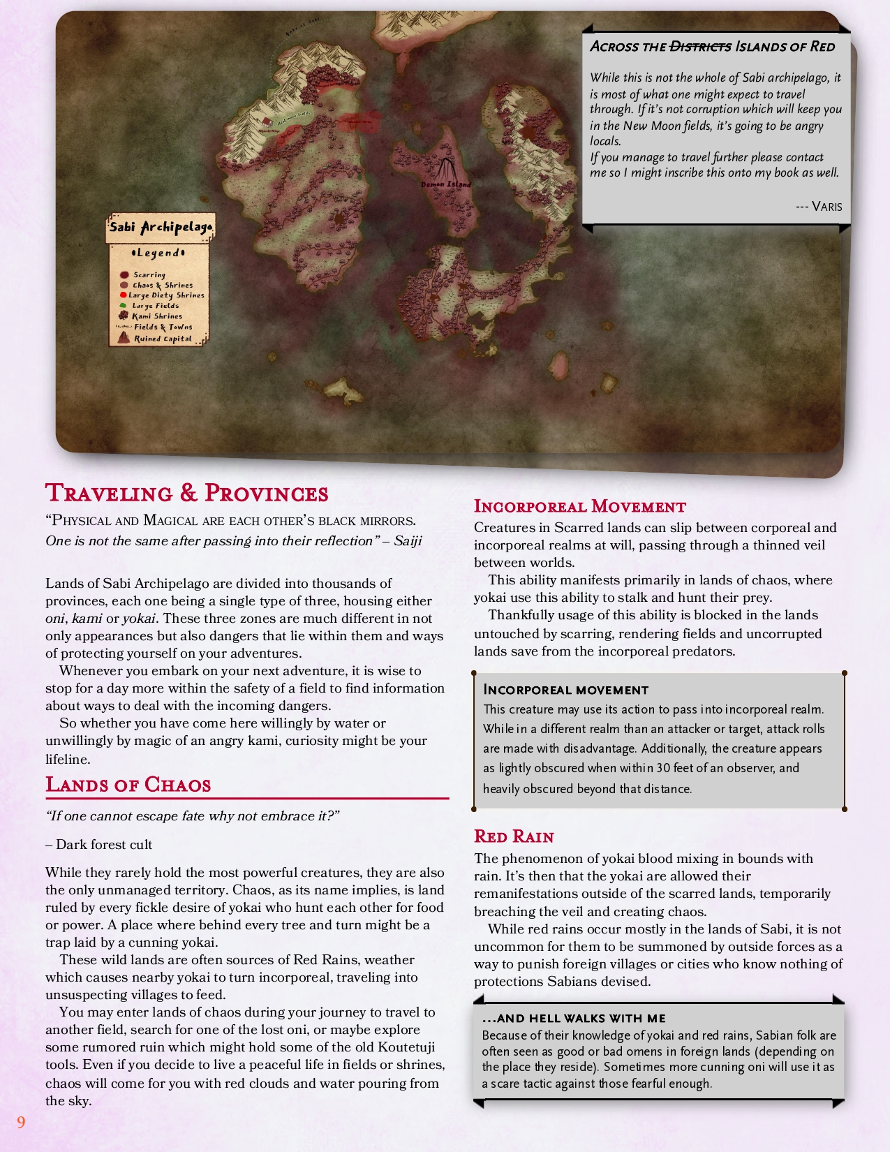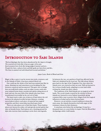 Blood & Rust is a D&D 5e setting guide for the Sabi Islands — a blood-red archipelago where ancient magic has torn the veil between the living world and an incorporeal realm.