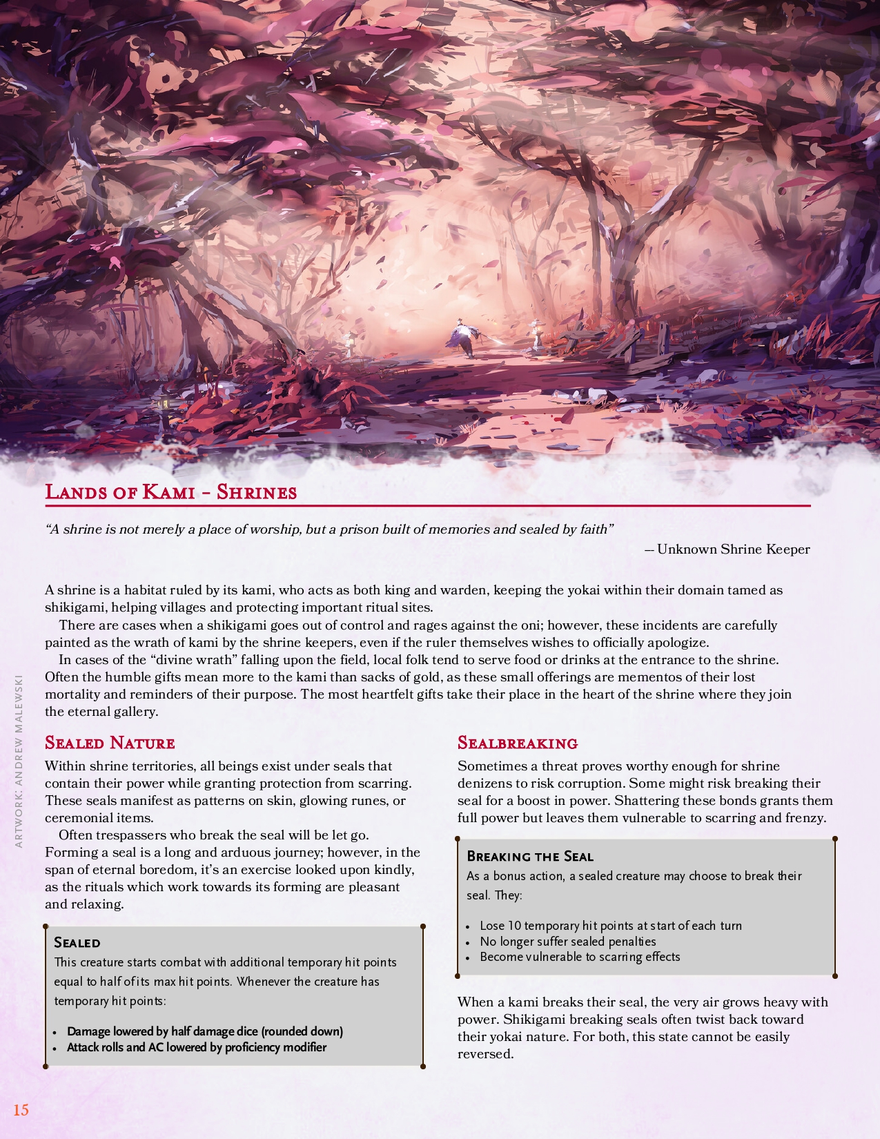 Domains of kami, gods who have carved order from corruption. They protect the surrounding fields and tame yokai into servants. Respect the shrine. Don't break the seal.